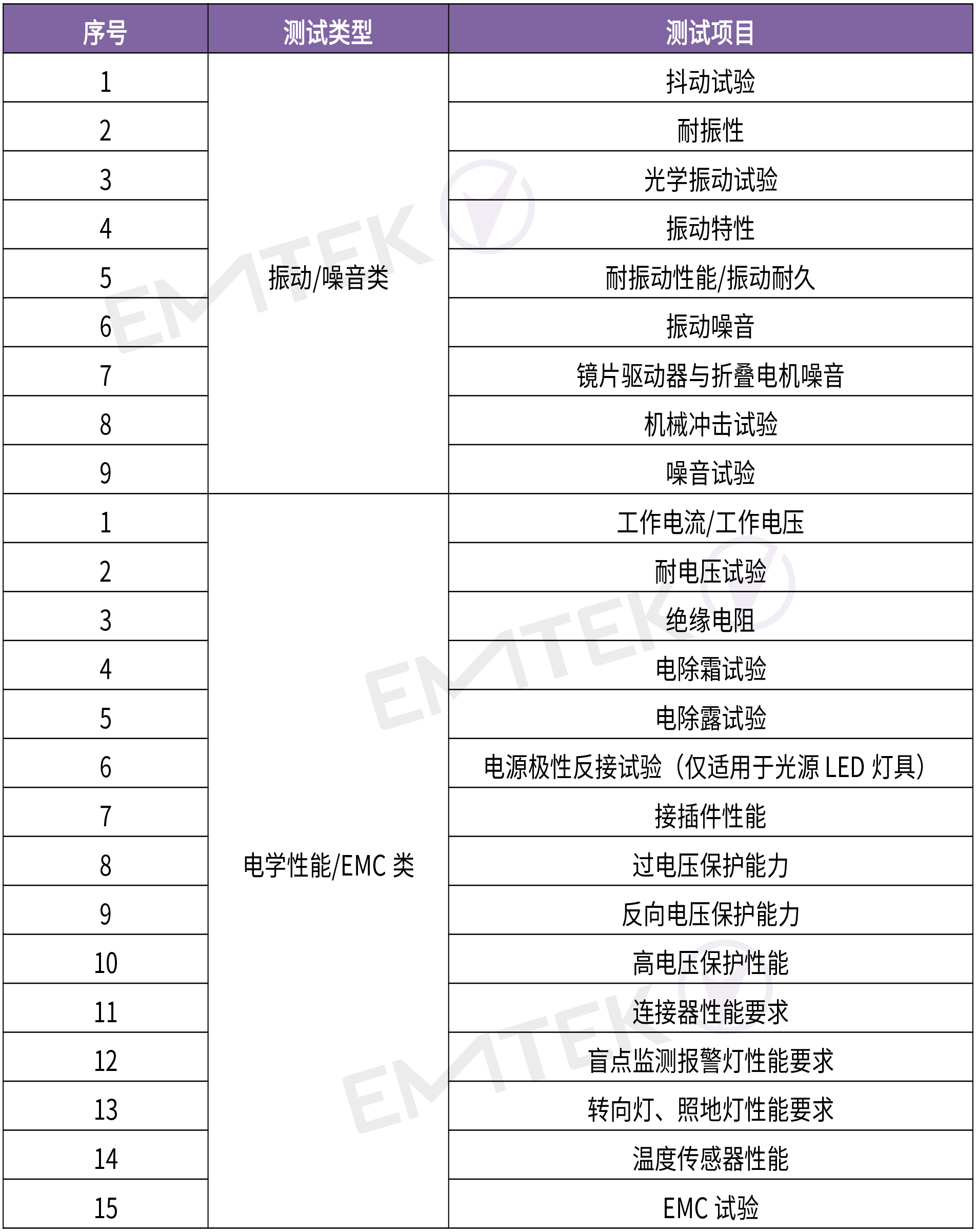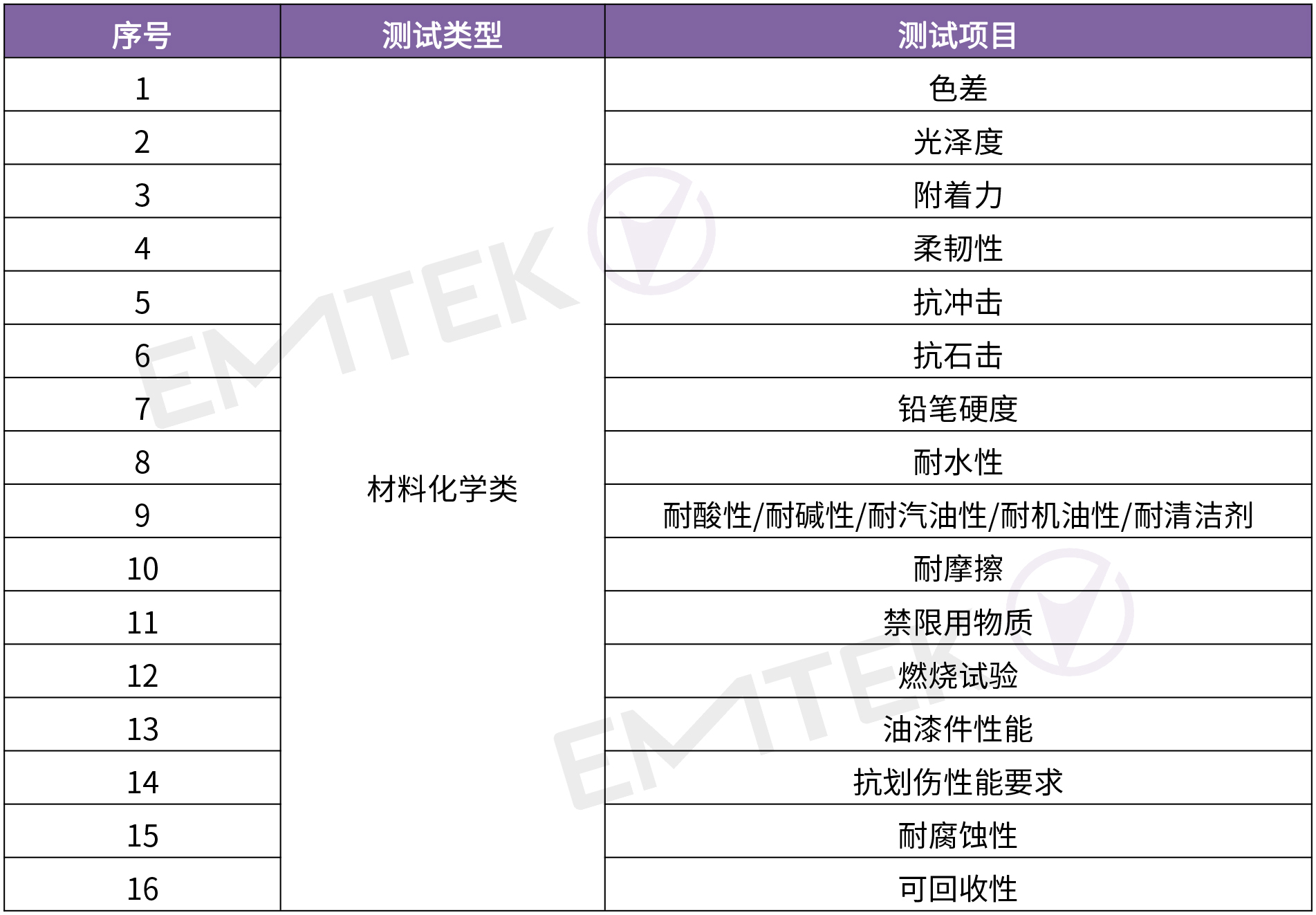4. 材料化学试验:考核后视镜及其喷漆件材料化学性能,比如耐酸性、耐碱性、耐洗涤性、耐汽油、耐酒精、耐摩擦、耐冲击、湿热储存、耐水性、耐指纹、耐机油、铅笔硬度、有害物质限定试验、燃烧特性试验等。