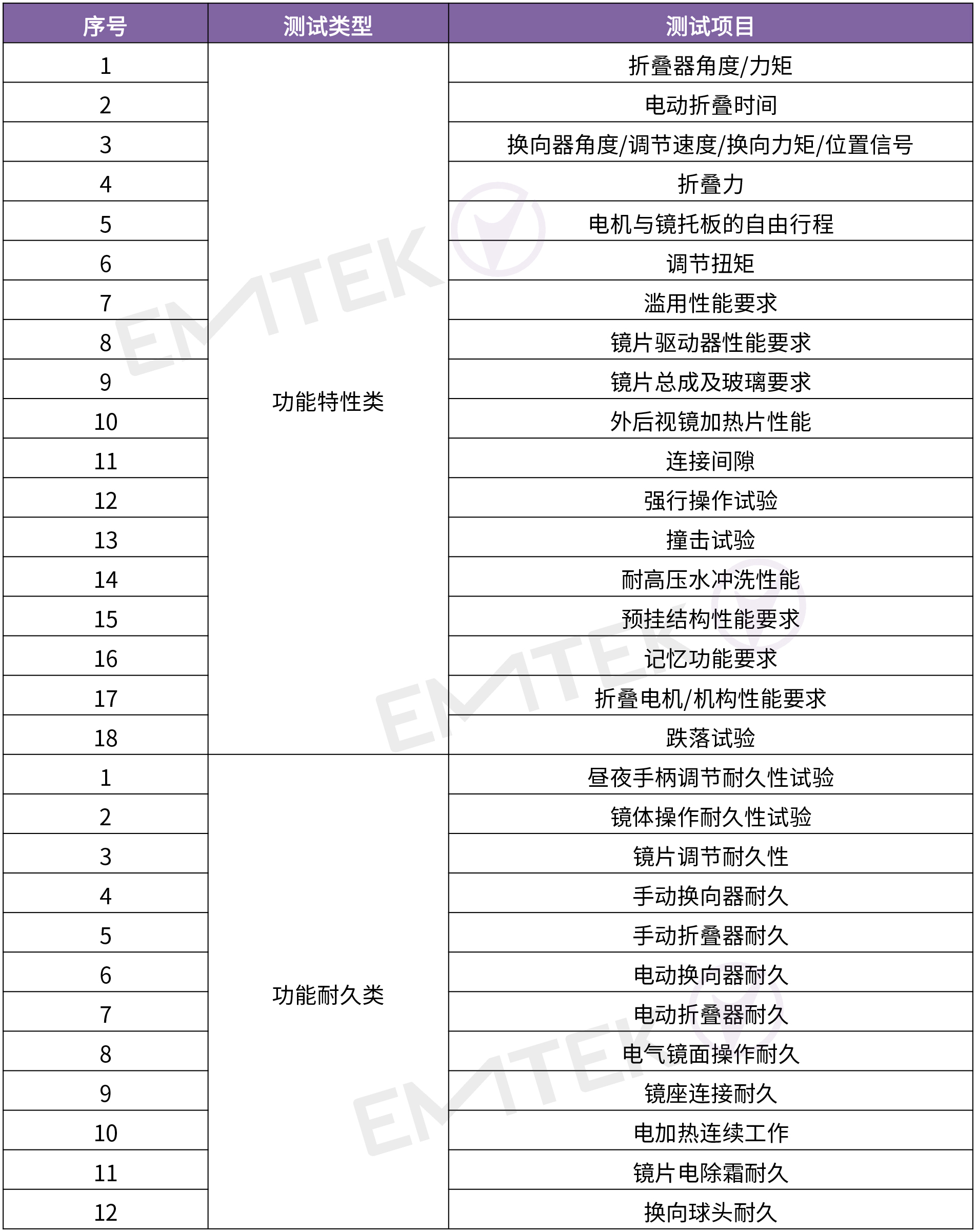2. 功能可靠性试验:考核后视镜使用过程中承受的强度和刚性、操作功能特性及耐久、振动试验,比如折叠器性能、换向器性能、手动/电动换向器/折叠器耐久、镜面操作耐久、撞击性能、振动耐久、噪音试验等;