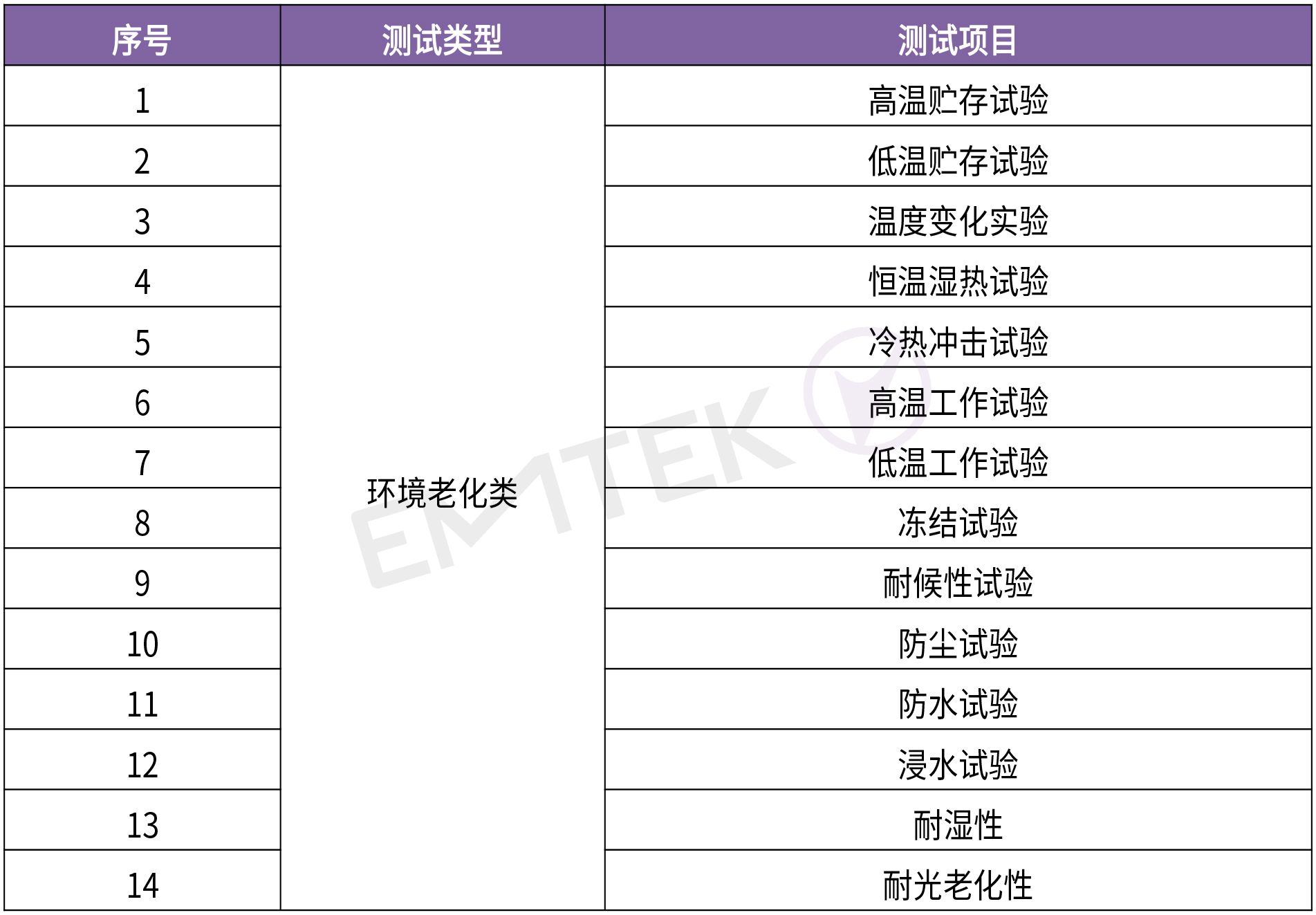 1. 环境可靠性试验:是将产品暴露在自然的或人工的环境条件下经受其作用,以评价产品在实际使用、运输和贮存的环境条件下的性能,并分析研究环境因素的影响程度,包含的环境试验如耐热性、耐湿性、冷热交变、防尘性、淋雨试验等;