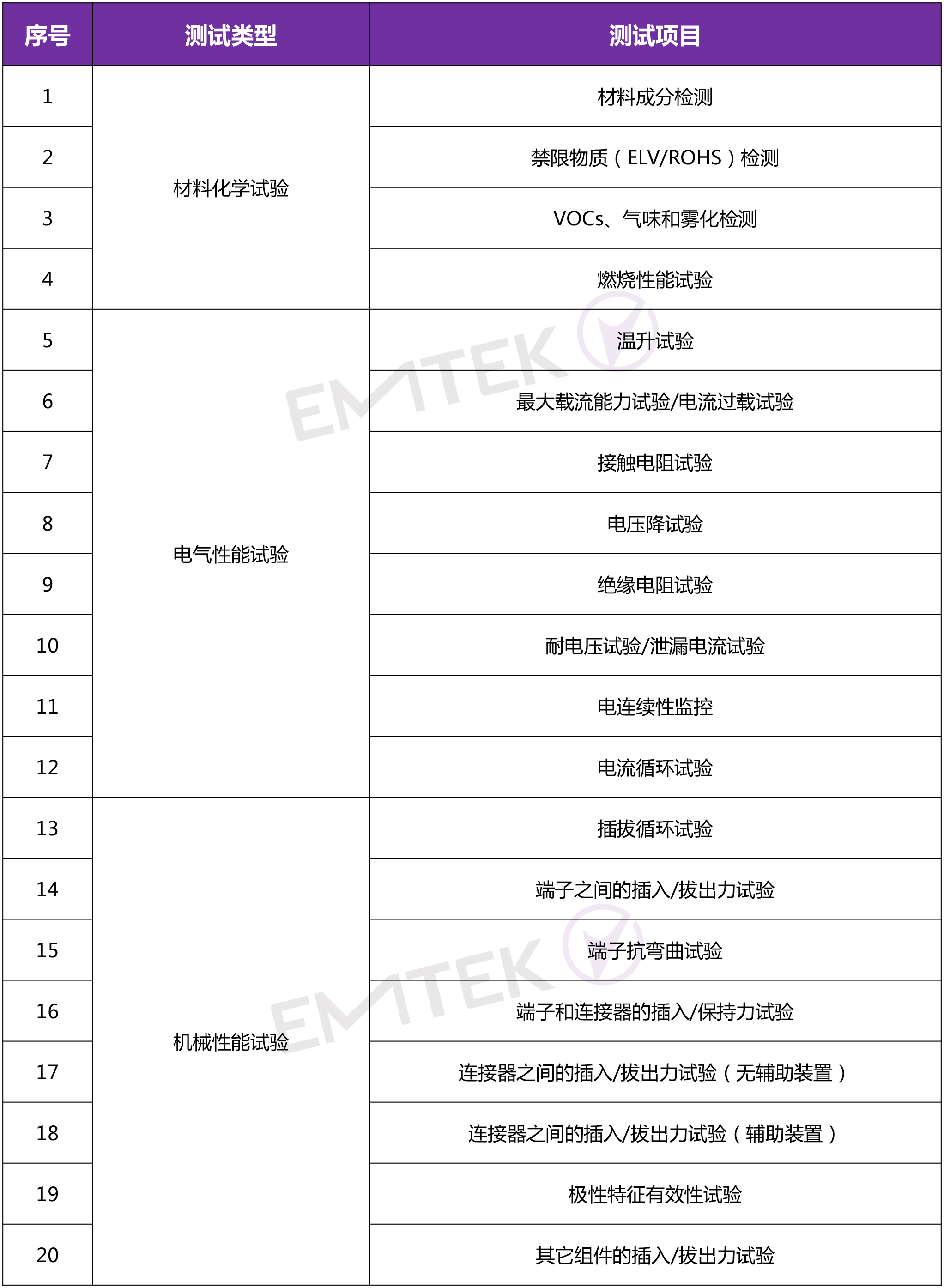 连接器等线束附件的测试包括材料化学、电气性能、机械性能和环境性能试验。