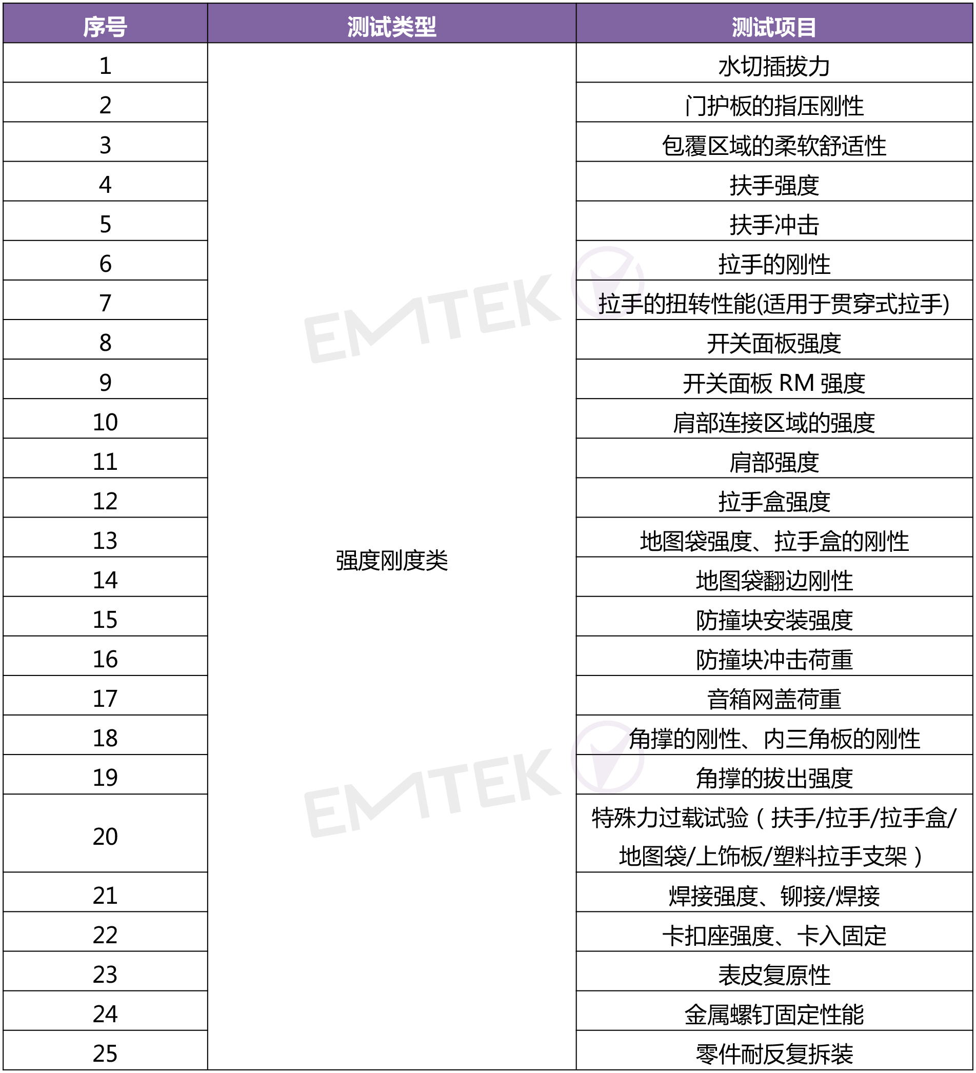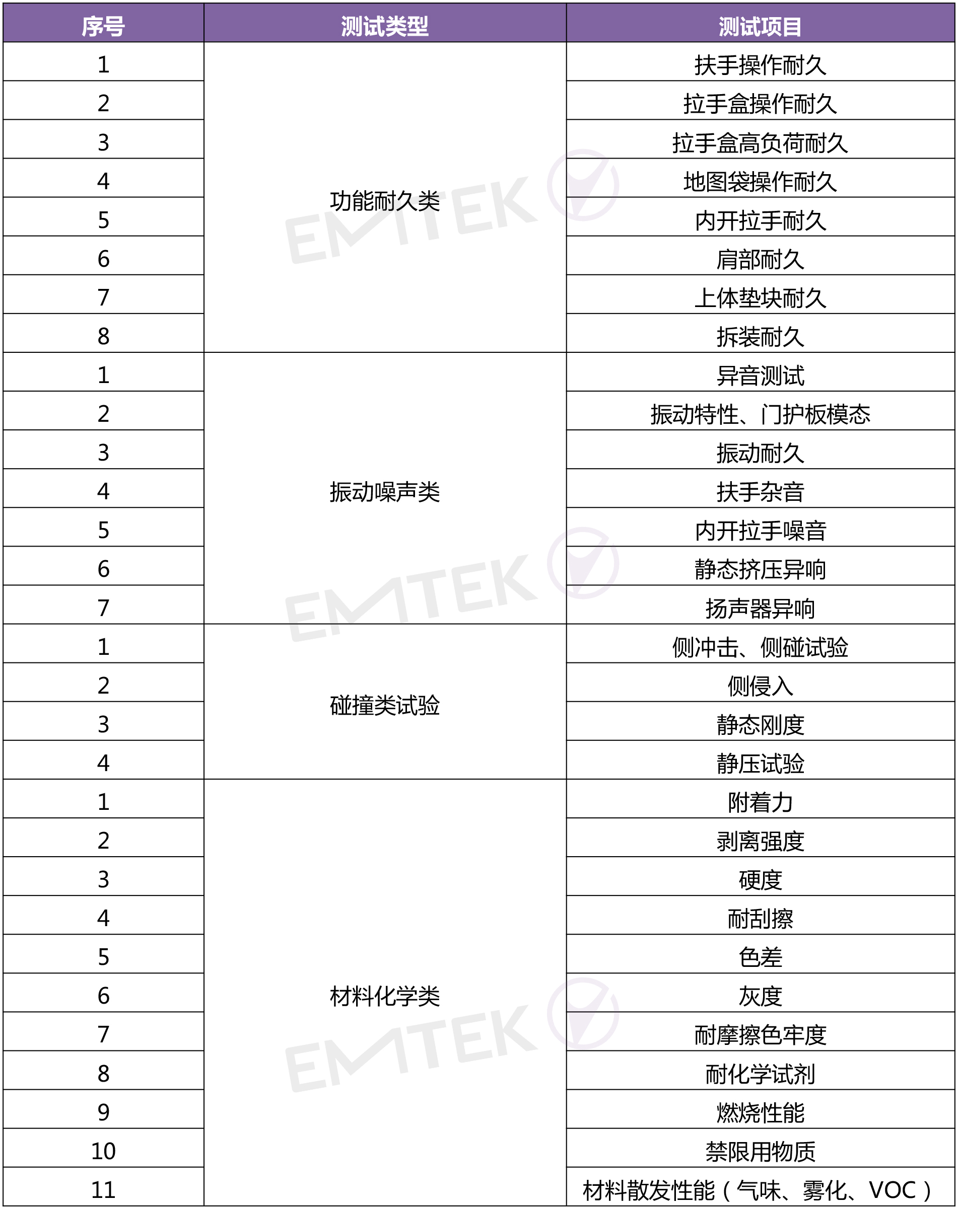 考核门板使用过程中承受的强度和刚性、操作功能特性及耐久、振动试验、碰撞试验(零件在突发事故中对乘员保护的能力),比如内开拉手耐久、拉手盒耐久、地图袋强度、扶手强度、拉手盒强度、振动特性、振动耐久、侧冲击、侧侵入等;