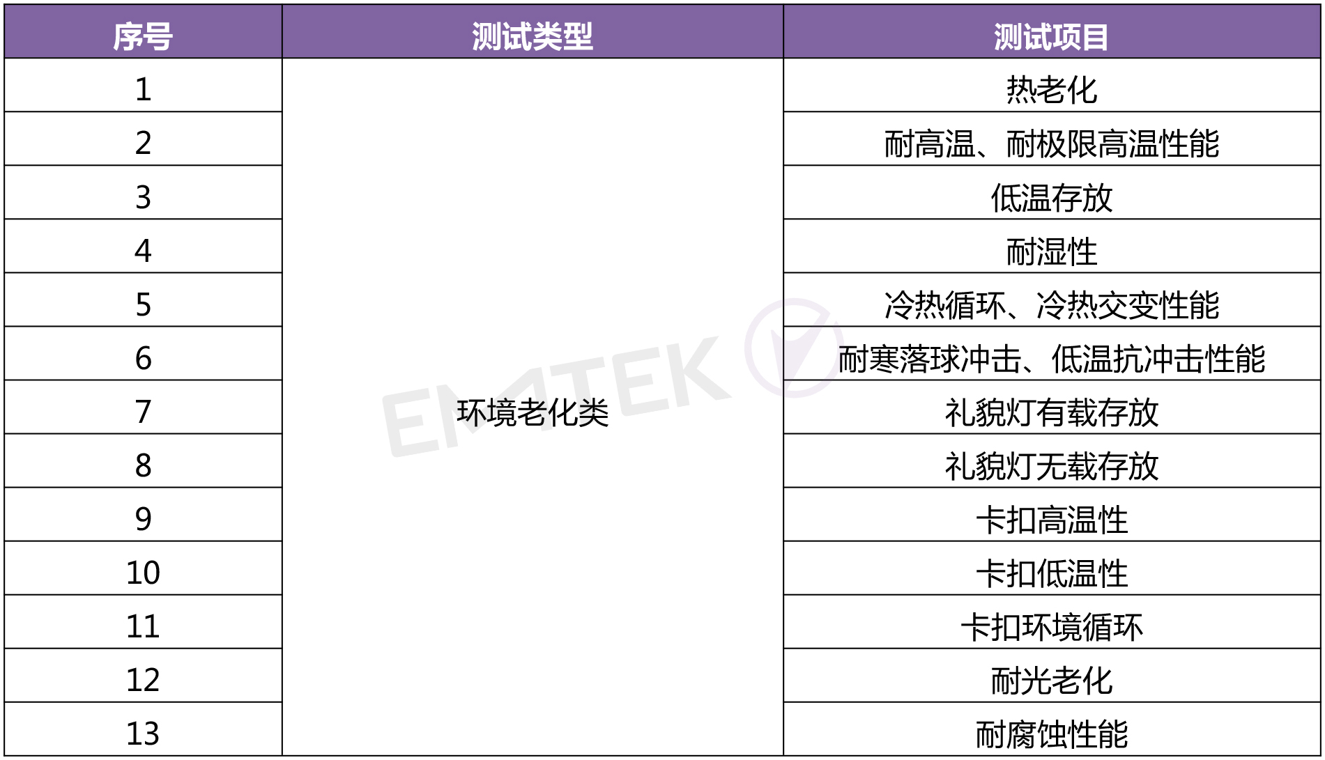 是将产品暴露在自然的或人工的环境条件下经受其作用,以评价产品在实际使用、运输和贮存的环境条件下的性能,并分析研究环境因素的影响程度,包含的环境试验如热老化、低温存放、冷热循环、低温冲击、耐光老化等;