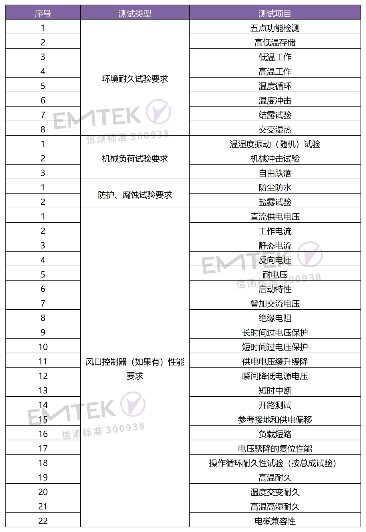 考核电动出风口控制器性能、总成试验性能、防尘防水、EMC等;