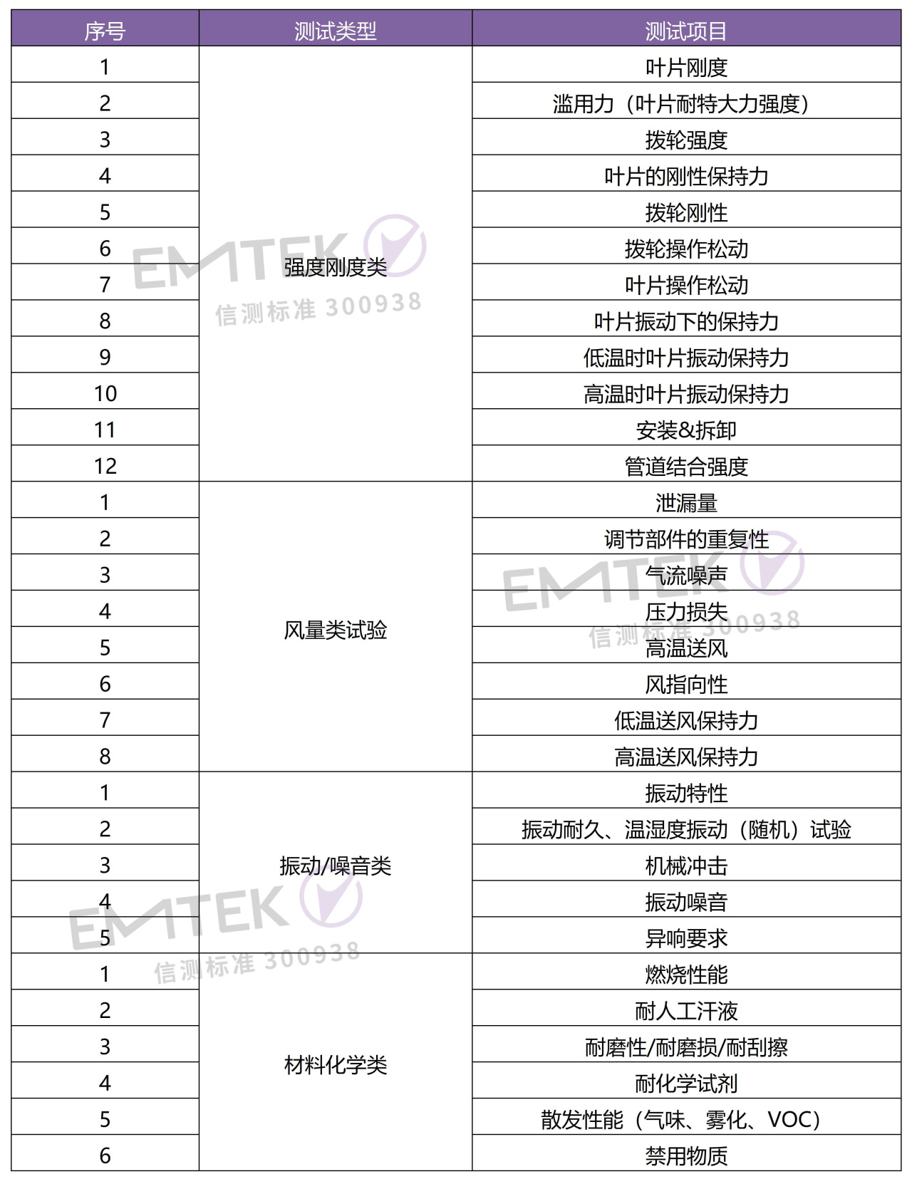 考核出风口/风管材料化学性能,比如燃烧性能、耐磨性、雾化、气味、禁用物质等。