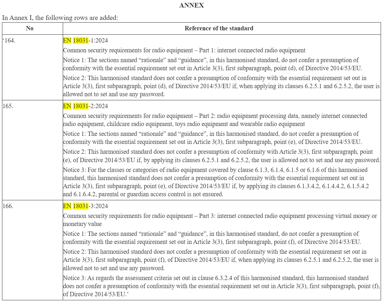 随着2025年1月30日Implementing Decision (EU) 2025/138在欧盟官网的发布,EN 18031已正式被欧盟官方引用为RED-DA法规的统一协调标准,这标示欧盟在无线电产品领域的网络安全合规迈出了重大的一步。虽然已被列入OJ,但官方也同时表示,EN18031的某些条款在RED-DA法规的符合性上仍具有限制性。