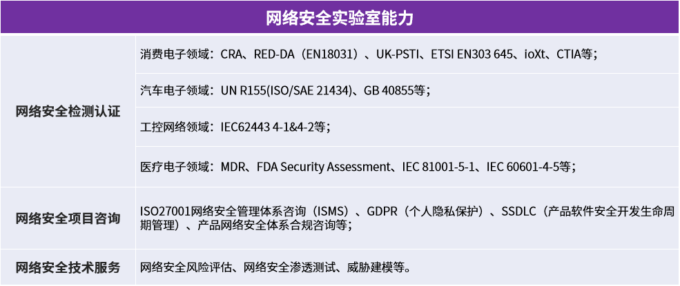 亚洲体育博彩平台标准网络安全实验室位于深圳市南山区亚洲体育博彩平台标准南山检测基地,属于亚洲体育博彩平台标准网络安全产线下属单位,实验室由拥有多年网络安全经验的网络安全专家及项目经验丰富的测试工程师组成,依据ISO 17025标准建设,具备符合资质要求的标准化环境、设备、人员及流程。目前已具备智能消费电子(含无线电设备)、汽车及汽车电子、医疗电子、工业控制网络等四大垂直领域的产品网络安全检测与认证能力,同时还具备半导体、物联网设备制造企业的OT端网络安全体系项目咨询、安全技术服务等相关业务的能力。