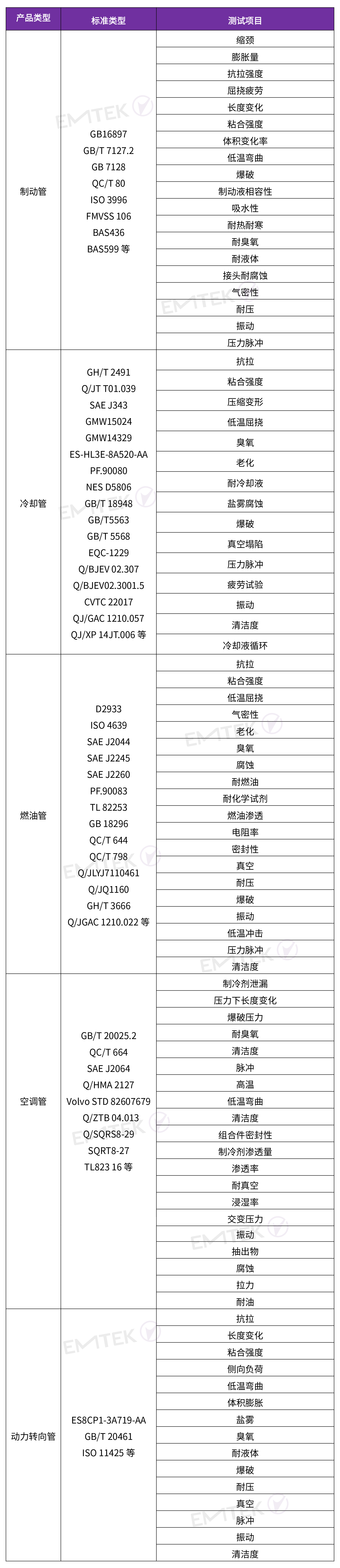 室温/高温爆破、耐压、耐真空、压降/泄露密封性、振动/寿命循环、气脉冲耐久、低压/高压脉冲、压力/振动/温度(PVT)、低温冲击、碎石冲击、真空坍塌、冷热冲击脉冲、挠曲疲劳耐久等;