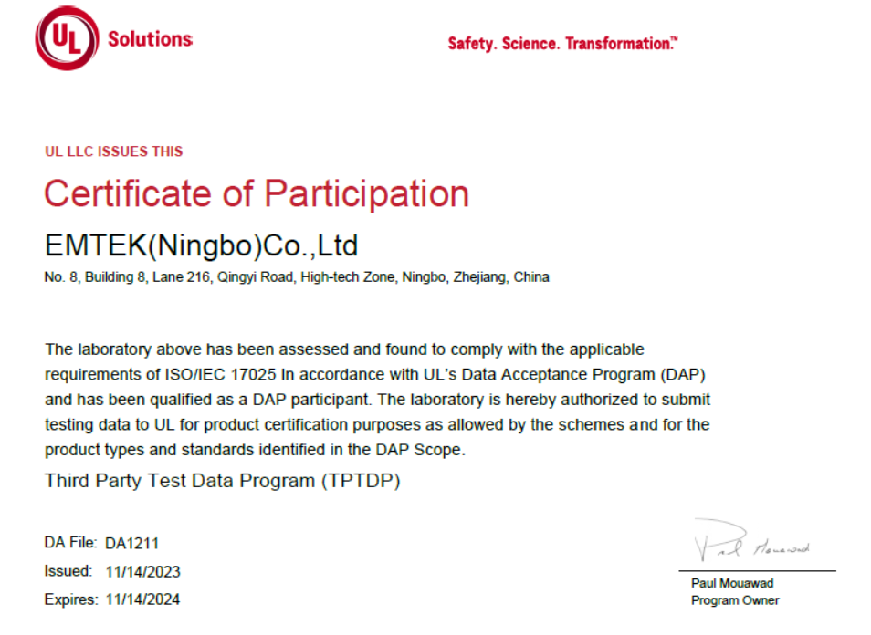 博彩平台排名标准(宁波)公司长期以来同UL保持密切友好合作,是UL公司多标准TPTDP免目击实验室和WTDP目击实验室,为客户缩短认证周期、节约差旅费/成本,更好体验博彩平台排名标准一站式、通全球的优质服务。