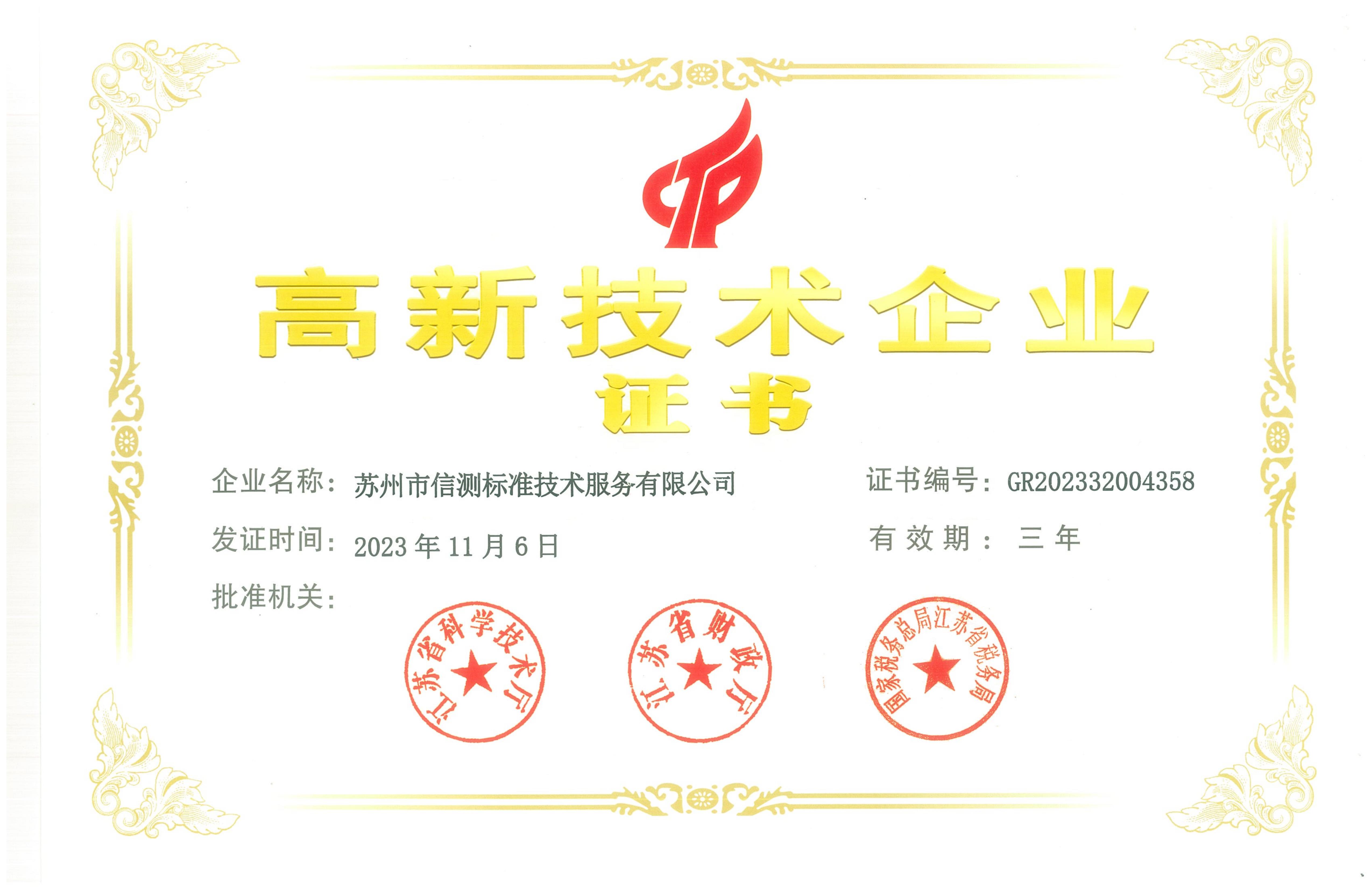 近日,苏州市亚洲体育博彩平台标准技术服务有限公司(以下简称:苏州亚洲体育博彩平台)再度获得由江苏省科学技术厅、江苏省财政厅、国家税务总局江苏省税务局联合颁发的“高新技术企业”认定证书!