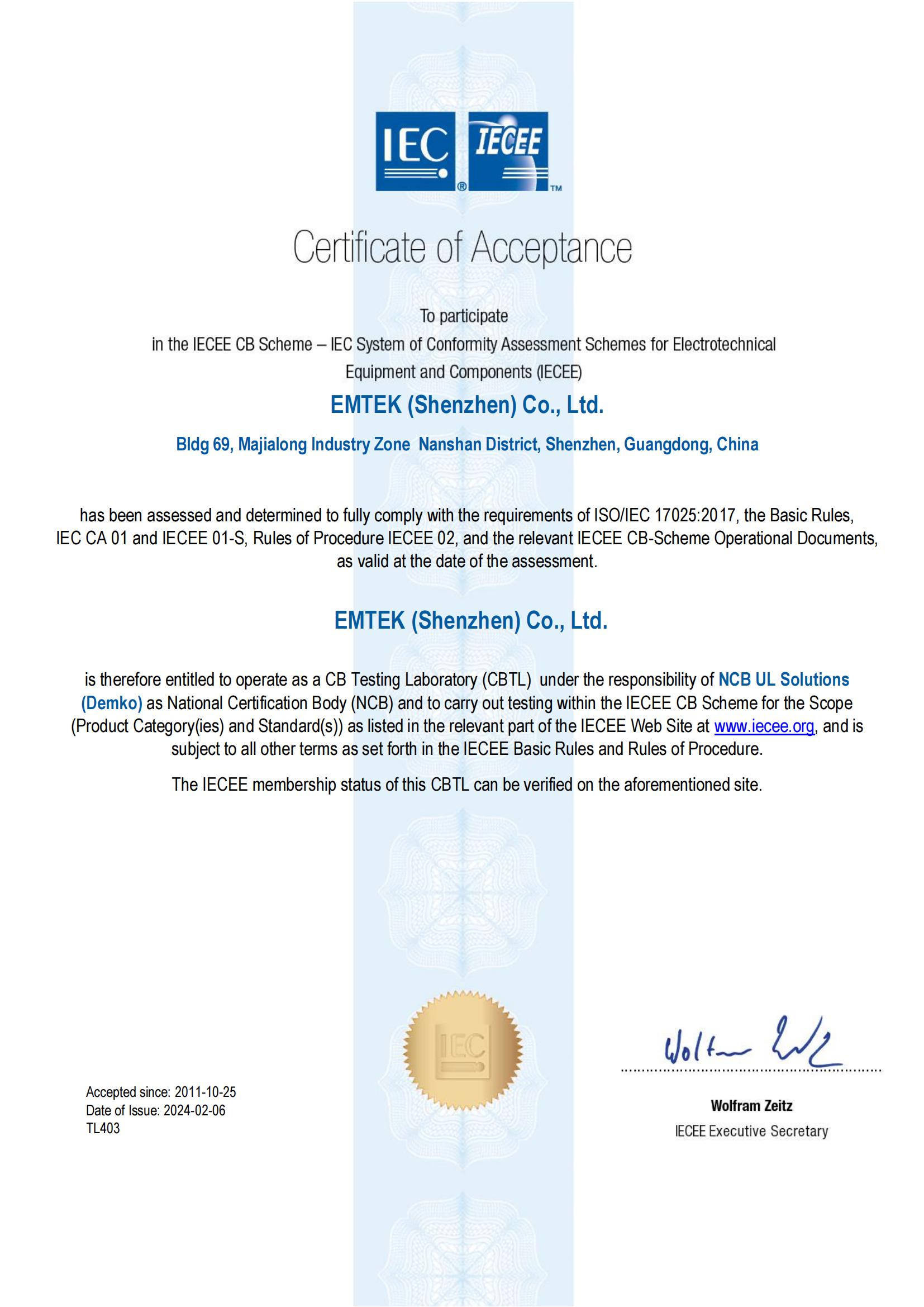 IECEE的认证授权资质证书