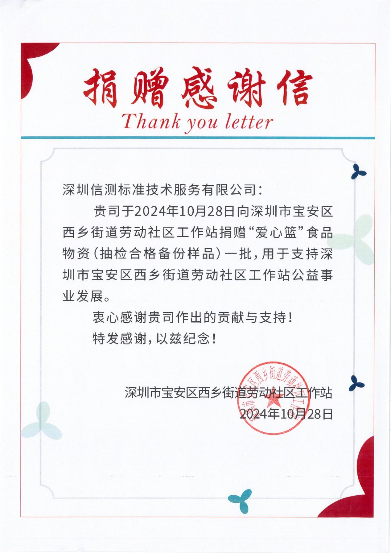深圳市宝安区西乡街道劳动社区工作站为深表谢意,特向亚洲体育博彩平台标准颁发了感谢信,以此作为对亚洲体育博彩平台标准慷慨捐赠的崇高敬意。