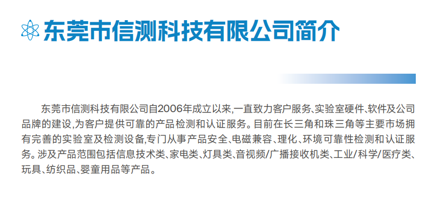 实验室总面积8000平方米,拥有可靠性检测中心、玩具检测中心,灯具检测中心,电池检测中心,鞋材与纺织品检测中心,汽车电子检测中心,音视频产品检测中心,信息技术设备检测中心,电源检测中心,EMC/RF检测中心共10个专业检测中心,检测基地已有专业成套检验检测设备1200套,获得了CNAS,CMA,A2LA,FCC等权威机构的认可,能够为电子电气产品,日用消费品,汽车电子产品提供一站式的产品全生命周期的测试认证服务解决方案。