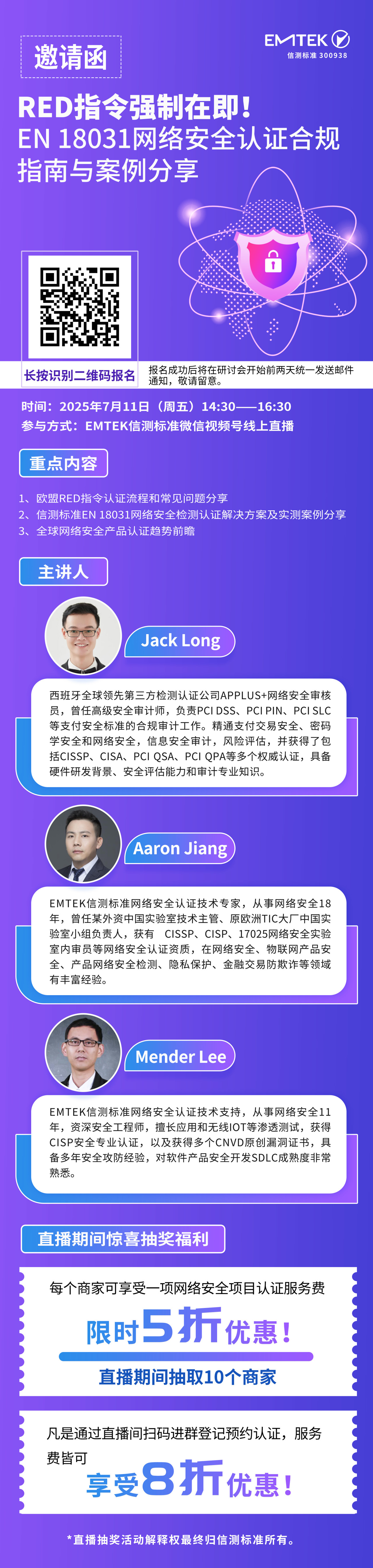 7月11日直播邀请|EN 18031网络安全认证合规指南与案例分享线上研讨会