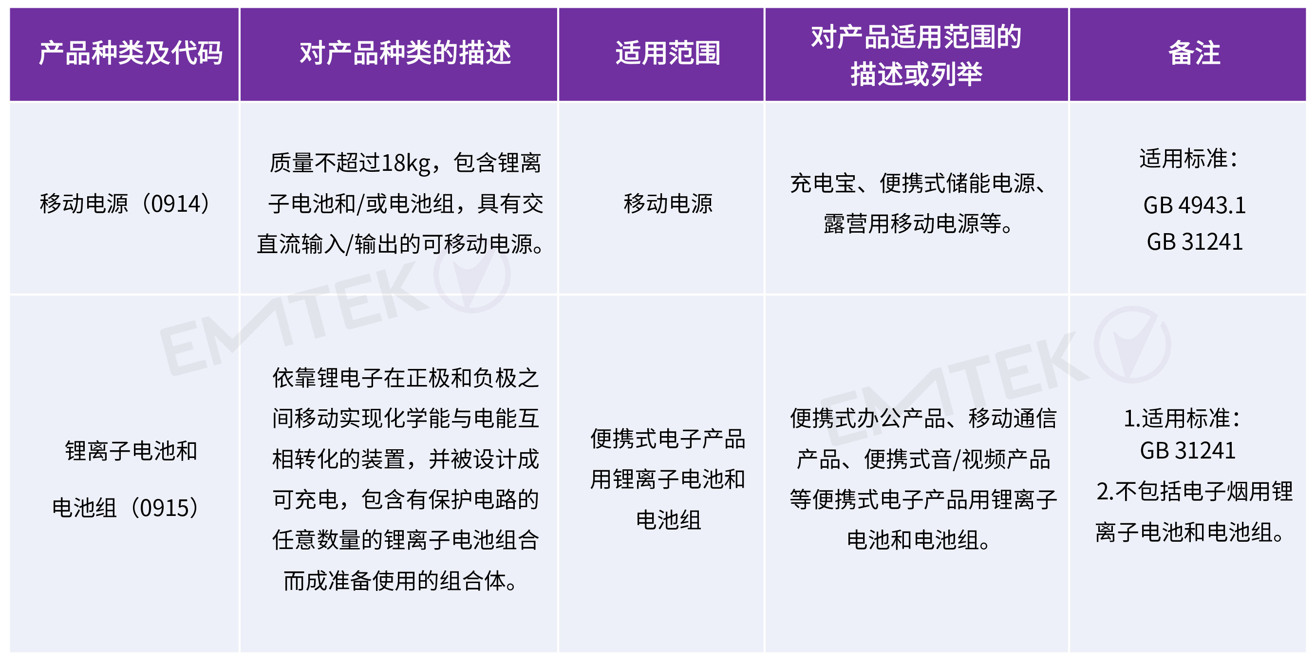 2022年9月17日,国务院办公厅(国办发〔2022〕31号)文件中明确电子电器产品使用的移动电源、锂离子电池和电池组纳入到强制性产品认证目录。2023年3月16日,认监委10号公告公布了移动电源、锂离子电池和电池组的认证界定范围,并公布自2023年8月1日起,指定认证机构开始受理新纳入产品CCC认证委托。2024年8月1日强制实施。
