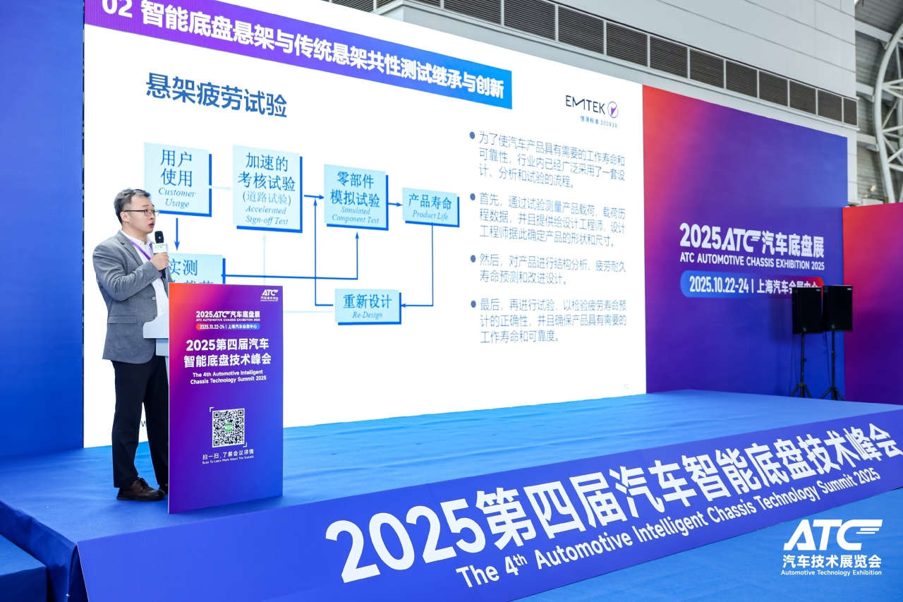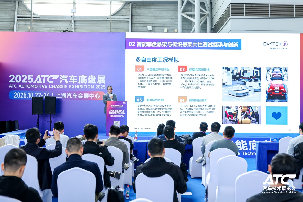 10月22日-24日,2025上海汽车底盘系统技术展览会(ATC汽车底盘展)在上海汽车会展中心(嘉定)盛大开幕。本届展会规模达28,000平方米,吸引了全产业链400余家展商及品牌参展,并同期举办10+场技术峰会与采购配对会等活动。EMTEK亚洲体育博彩平台标准精彩亮相展会,围绕汽车智能底盘检测技术方案,链接产业资源,助力行业安全合规与技术创新,并以《汽车智能底盘悬架测试研究》为主题参与2025第四届汽车智能底盘技术峰会热点演讲,与海内外行业专家和现场观众进行了深度分享交流。