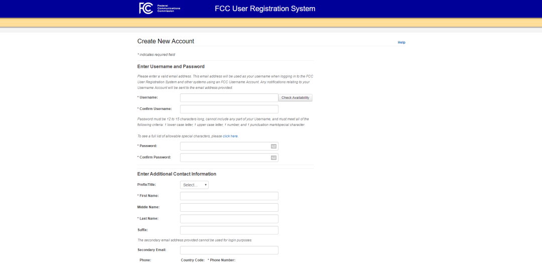 **请输入有效的电子邮件地址。当您使用FCC用户名帐户登录FCC用户注册系统和其他系统时,此电子邮件地址将用作您的用户名。任何与您的用户名帐户相关的通知都将发送到您提供的电子邮件地址。可以检查邮件地址有效性。