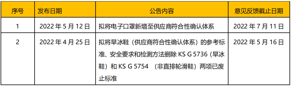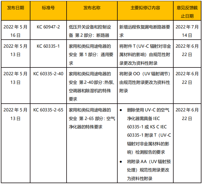 2022 年 6 月消息,韩国技术标准院(KATS)发布数项公告,就多个电气安全标准和家用产品安全标准的修订公开征求意见,相关内容见下表。