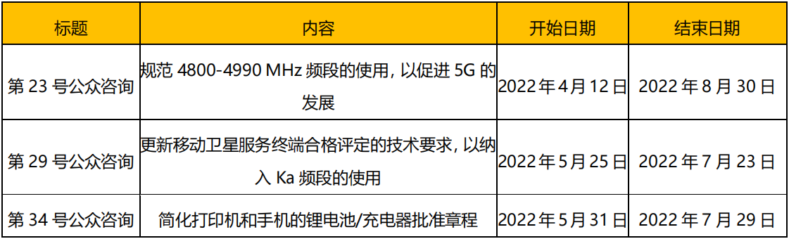 2022 年 6 月消息,巴西国家电信管理局(ANATEL)发布了多项公众咨询,详情请见下表: