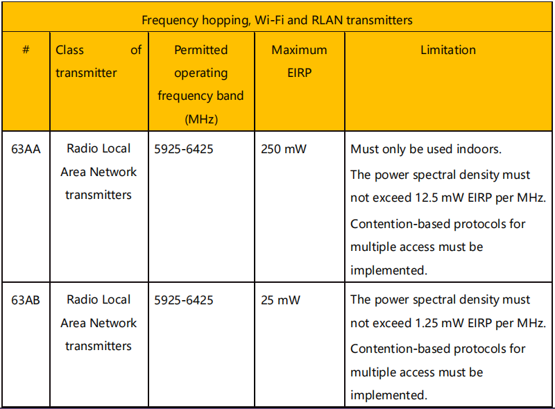 目前的文件增加了一个新的频段:5925-6425MHz,用于无线电局域网发射器的低功率水平下的运行,并纠正了以前在载波频率方面的错误。
