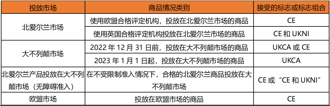 受 UKCA 认证法规影响的产品包括但不限于个人防护装备(PPE),如头盔、太阳眼镜,玩具,电子电气设备(EEE)等。欧盟、大不列颠、北爱尔兰市场各市场在不同阶段可以接受的标志如下:
