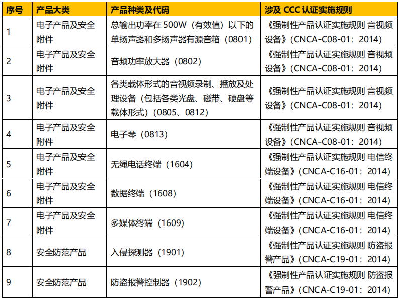 二、《强制性产品认证实施规则 音视频设备》(CNCA-C08-01:2014)和《强制性产品认证实施规则 电信终端设备》(CNCA-C16-01:2014)适用范围删除相关产品;废止《强制性产品认证实施规则 防盗报警产品》(CNCA-C19-01:2014)。