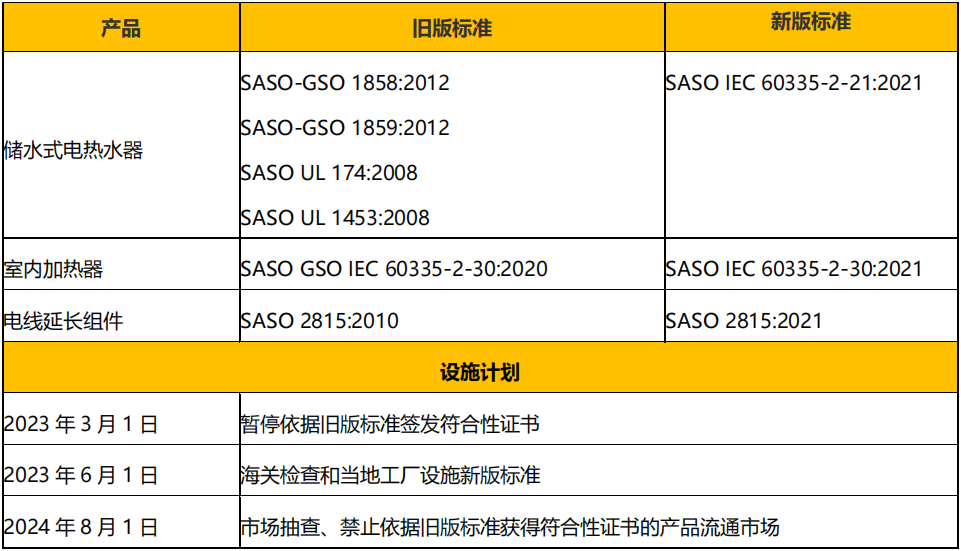 2022 年 10 月消息,根据沙特阿拉伯标准、计量和质量局(SASO)最新通知,有关储水式电热水器、室内加热器和电线延长组件新版标准的实施计划如下: