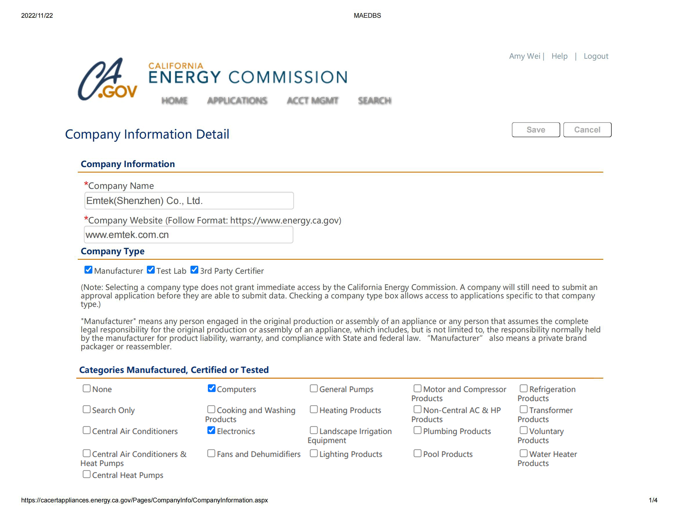 加州能源委员会 (CEC) 要求受监管的电器必须满足CEC Title20电器能效标准要求,并在CEC能效数据库系统(MAEDbS)中注册列名,注册信息包括品牌名称、制造商名称和型号等。