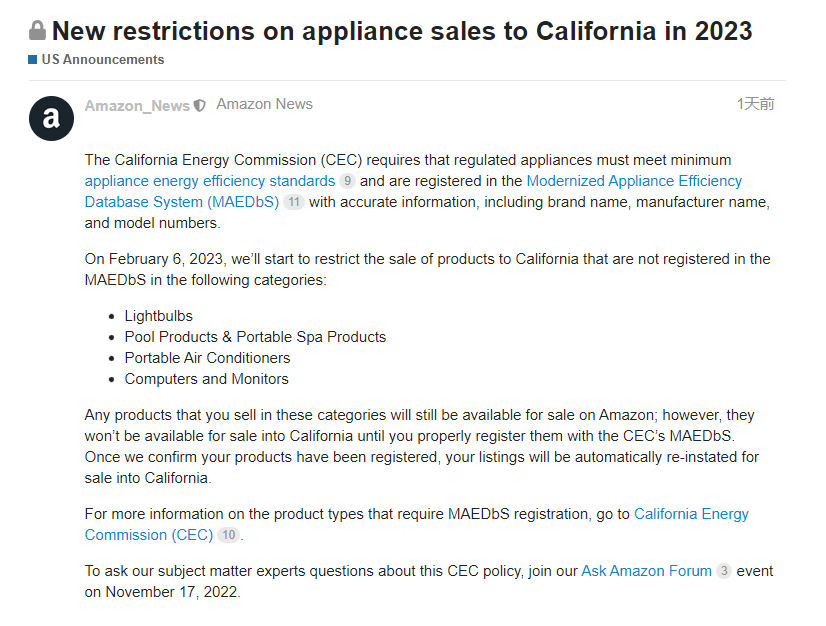 平台商家在销售上述商品时,若未在CEC的MAEDbS正确注册,商品将无法通过亚马逊在加利福尼亚州销售。只有亚马逊确认商品已完成注册后,商品才会自动恢复,允许在加利福尼亚州销售。