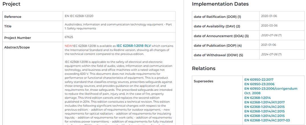 为了解决这一问题,并综合考虑到未来EN IEC 62368-1第四版的出版,以及它在EUOJ中LVD和RED下的潜在引用,经过TC108X成员投票,大多数成员同意将EN IEC 62368-1:2020(第三版)的强制执行日期延长18个月至2024年7月6日。在此日期之前,仍然可以使用EN 62368-1:2014(第二版)申请CE。如下为CENELEC网站更新公示信息,EN IEC 62368-1:2020(第三版)的DOW是2024年7月6日。