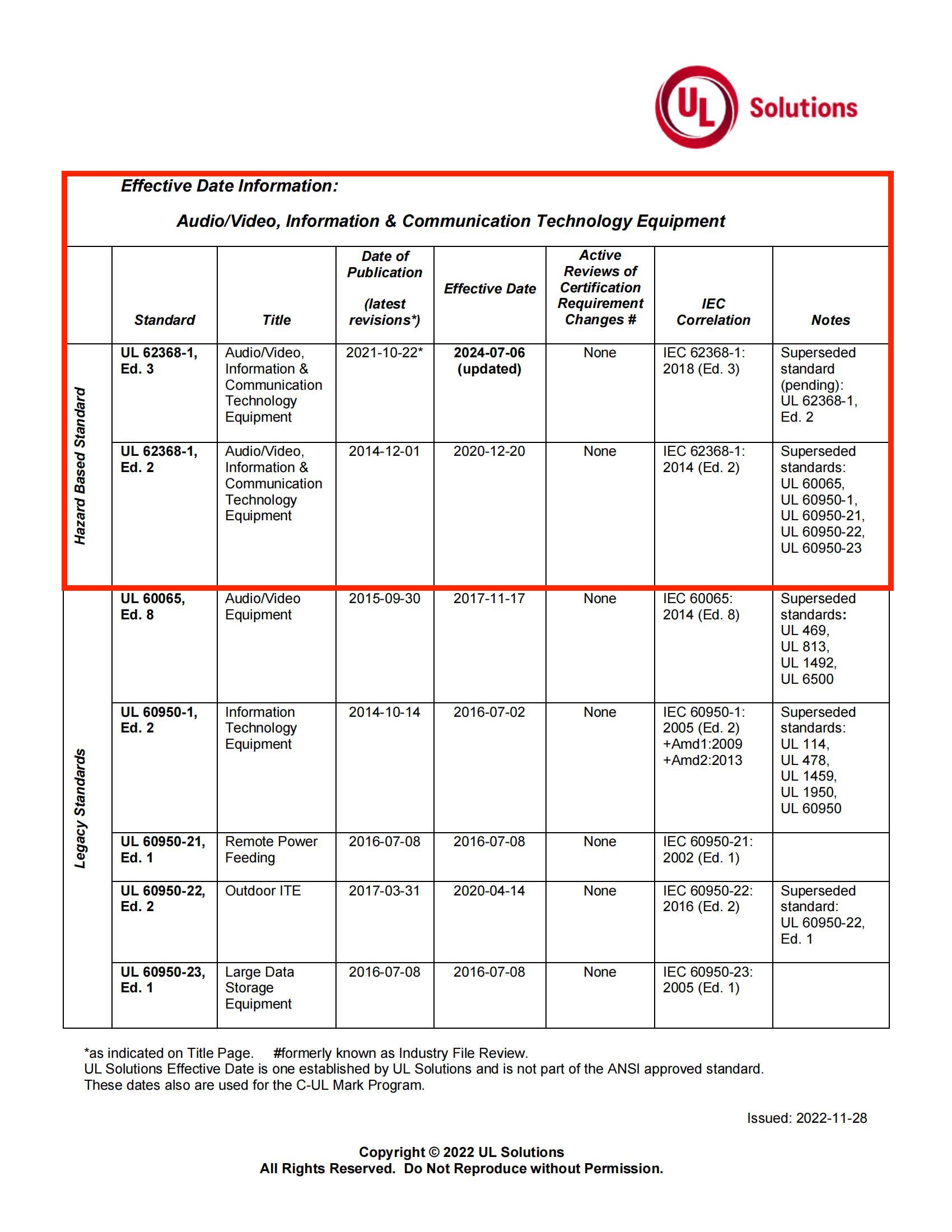 UL在2022年11月28日发布更新,UL 62368-1, Ed. 3生效日期更新到2024-07-06,这意味UL 62368-1第三版生效日期更新与欧洲一致。
