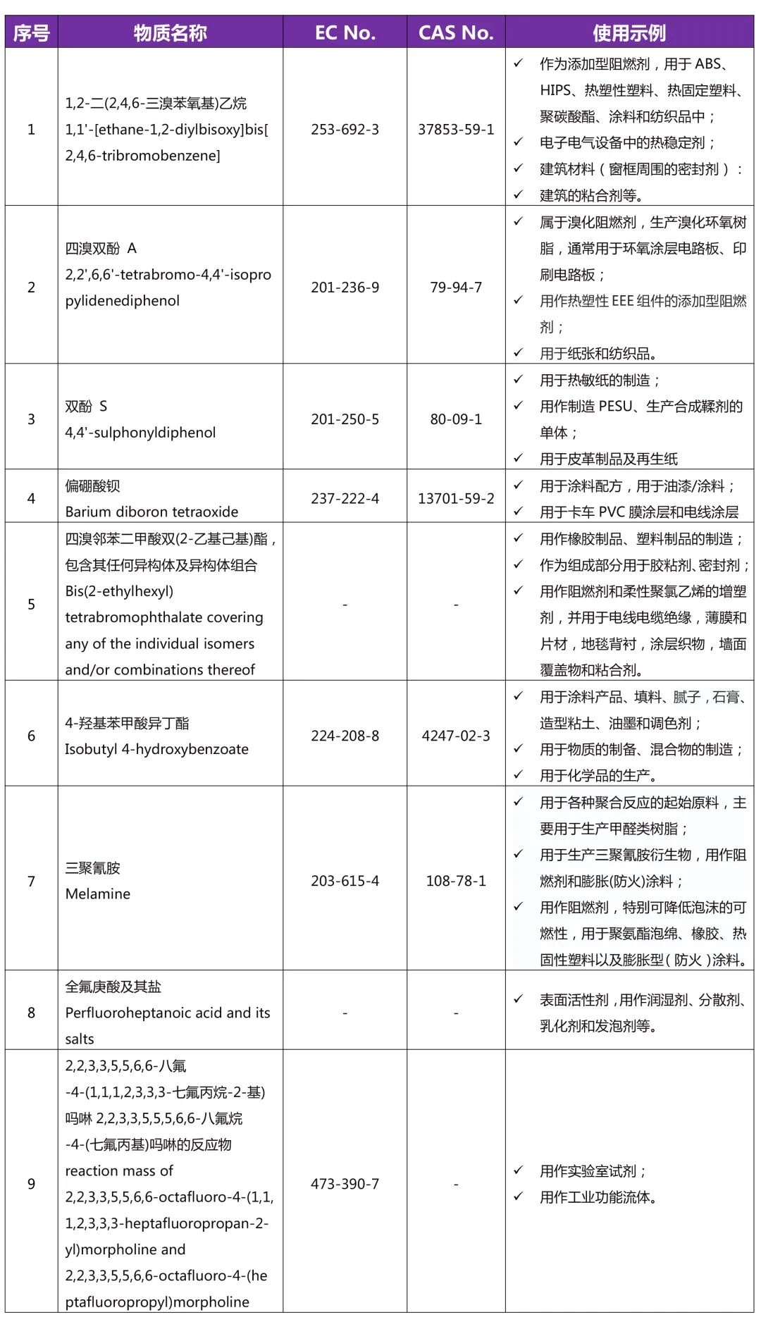 2023年1月17日,欧洲化学品管理局(ECHA)将2022年9月2日公布的9项潜在高度关注物质正式加入到SVHC候选物质清单。此次限制部分物质如四溴双酚A、双酚S、三聚氰胺等常用物质将对相关行业产生较大影响。