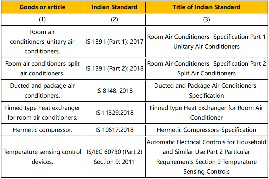 2022 年 12 月 14 日,印度标准局(BIS)发布公告,制冷设备强制安规 ISI 认证的实施时间再次推迟实施,下列产品的强制日期推迟到 2024 年 1 月 1 日。