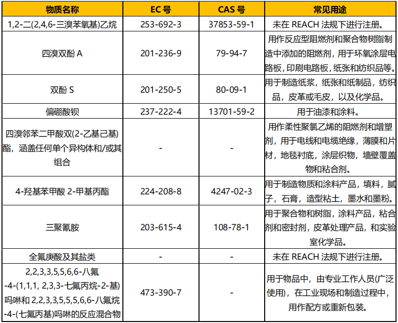 2023 年 1 月 17 日,欧洲化学品管理署(ECHA)正式公布第 28 批 9 项 SVHC 高关注物质,至此 REACH法规下 SVHC 高关注物质清单(又称:候选授权物质清单)总数已达到 233 项。本次更新增加了四溴双酚 A和三聚氰胺两个常用物质,对相关行业影响巨大。