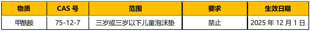 2023 年1 月26 日,美国纽约州发布草案 S02983《无甲酰胺儿童产品法》,提议禁止在三岁及三岁以下儿童泡沫垫产品中使用甲酰胺。如法案通过,该要求将于2025 年 12 月1 日正式实施。