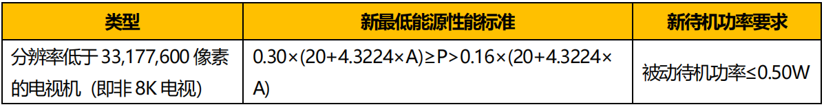 自2024年4月1日起,所有在新加坡销售的分辨率低于33,177,600像素的电视机(即非8K电视)须满足新的MEPS(新的最低能源性能标准)要求如下表: