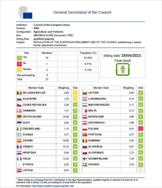 欧盟成员国以 24 票赞成、1 票反对、2 票弃权的结果通过了 CBAM。另外被通过的立法还包括欧盟碳市场(ETS)指令的修订、设立社会气候基金的法规、海运船舶排放的 MRV 规则的修订,以及航空业相关的碳市场规则的修订。