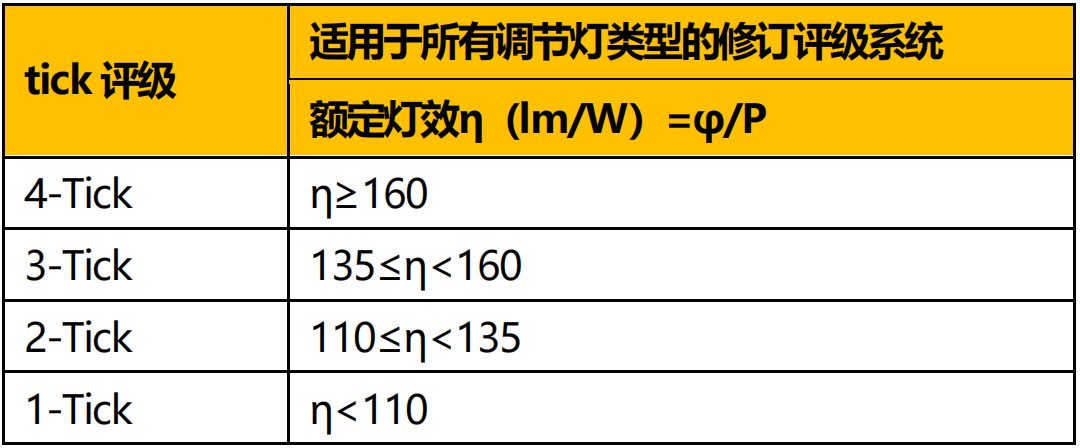 (2)所有受管制的灯泡 tick 评级将整合为单一评级,如下表:
