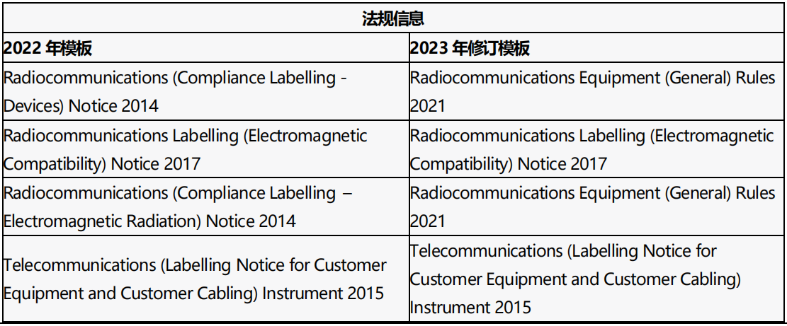 2023 年7 月消息,澳大利亚通信和媒体管理局(ACMA)修订了供应商合规声明(SDoC)模板,此次更新有一些措辞更新,但重点变更集中在法规信息方面,请参考重点如下表。