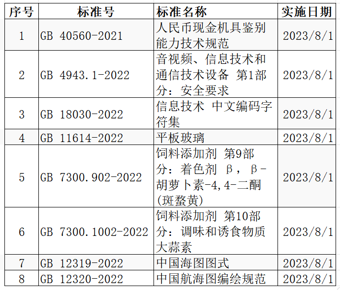 2023 年7 月消息,自2023 年8 月1 日起,8 项强制性国家标准、9 项推荐性国家标准开始实施,具体标准名单如下: