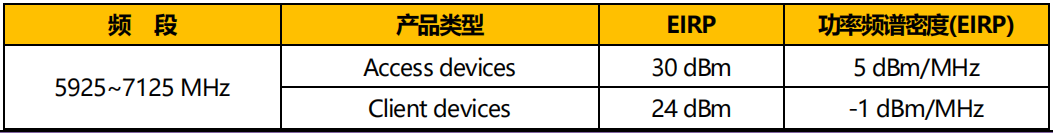 新决议将5925-7125 MHz 定义为非管制频段,其运行条件如下所示,并仅允许应用于室内低功耗设备。
