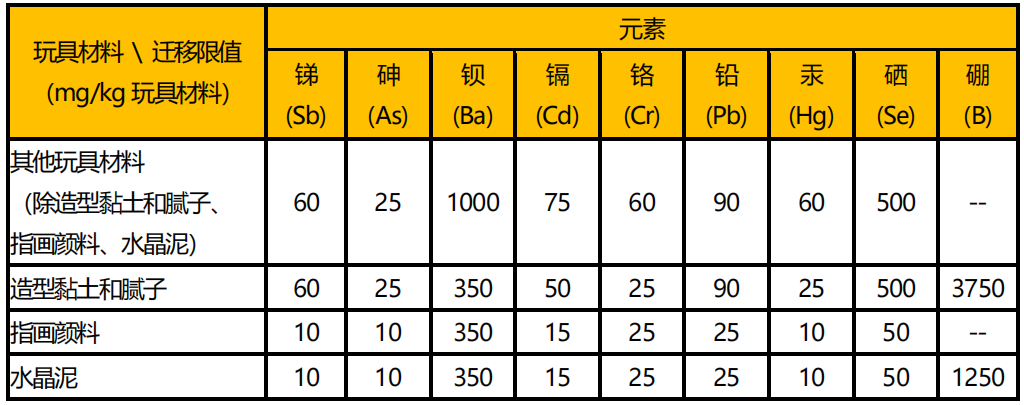 因而,各种玩具材料的元素迁限限值如下所示: