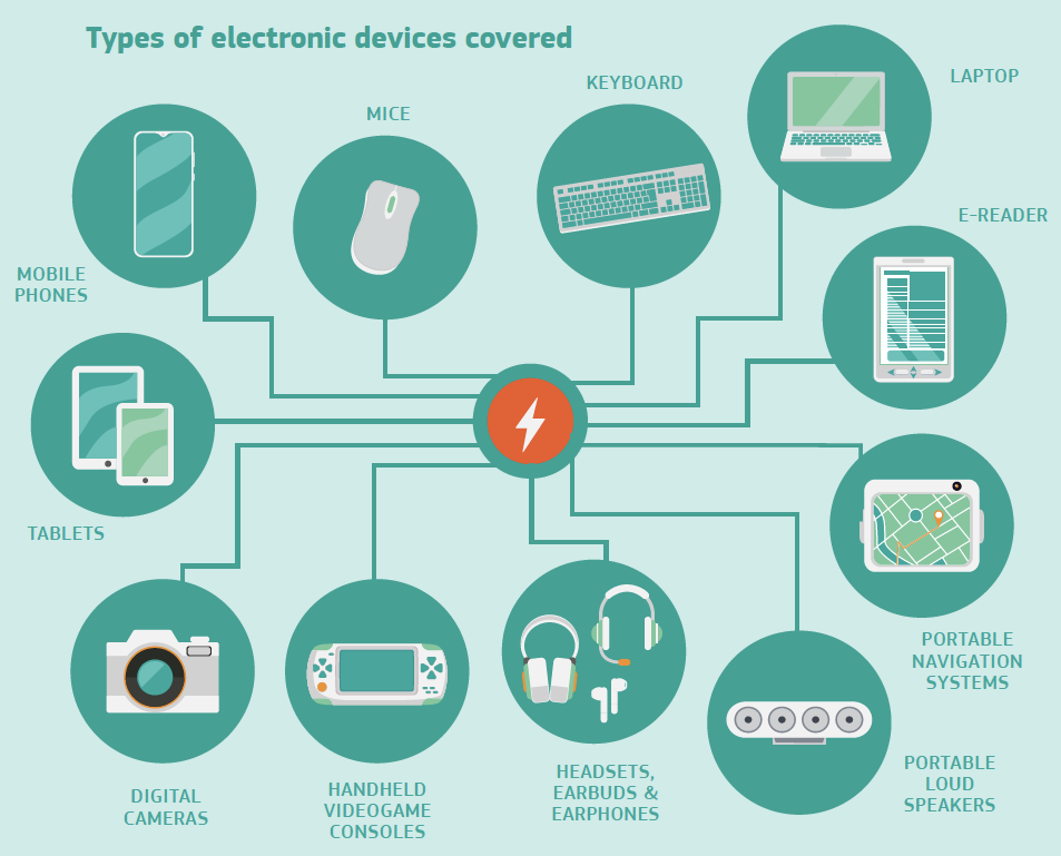 该修订指令涵盖手机、平板电脑、数码相机、头戴式耳机、带麦克风的头戴式耳机 、手持游戏机、便携式扬声器、电子书、键盘、鼠标、便携导航、入耳式耳机及笔记本电脑等共13类无线设备。