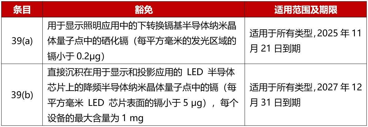 2024 年 5 月 21 日,欧盟在官方公报上发布(EU) 2024/1416 指令,更新欧盟 RoHS 指令(2011/65/EU)附件 III 中关于镉的豁免条款,延长第 39(a)条款的豁免期限,新增第 39(b)条款的豁免。该指令将于发布后 20天生效,各成员国应于 2024 年 12 月 31 日前将其转化为本国法规,该豁免将于 2025 年 1 月 1 日起正式实施。