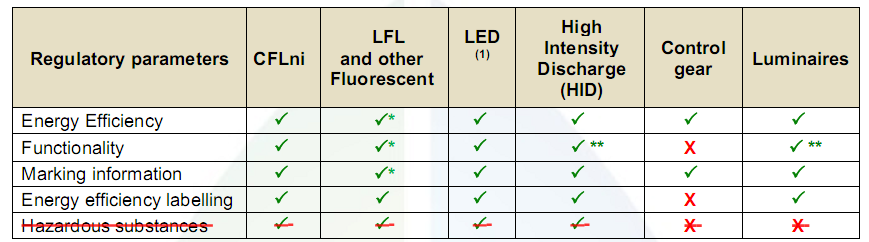 - 光通量小于 30 流明或大于 6500 流明的照明产品;