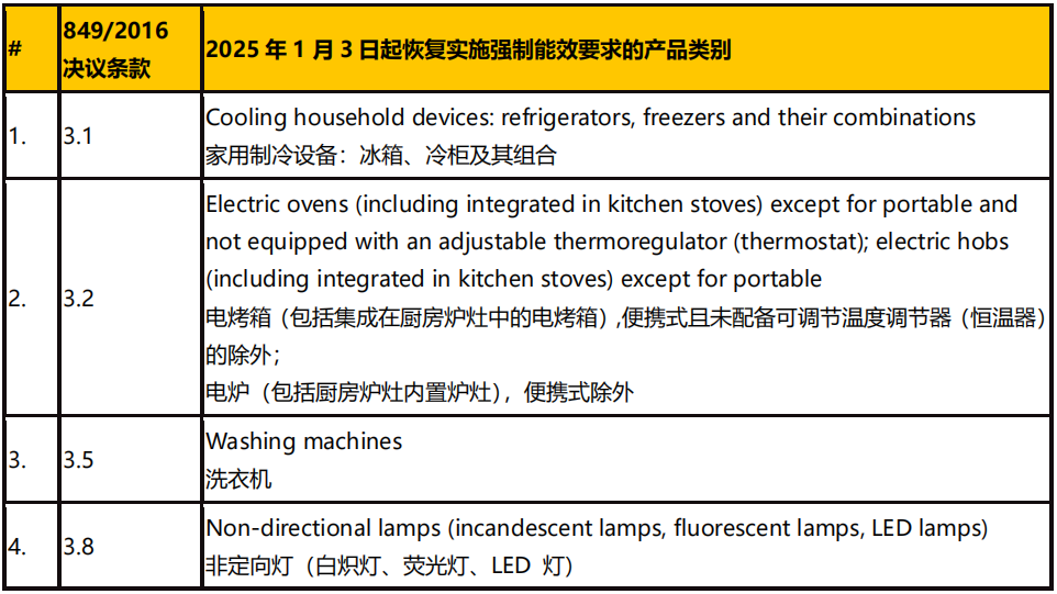自 2025 年 1 月 3 日起,上述四类产品在投放白俄罗斯市场时,必须附有白俄罗斯能效证书。该证书应由白俄罗斯认可的能效认证机构颁发,产品在入关和上市销售时将被核查是否已获得白俄罗斯能效证书。