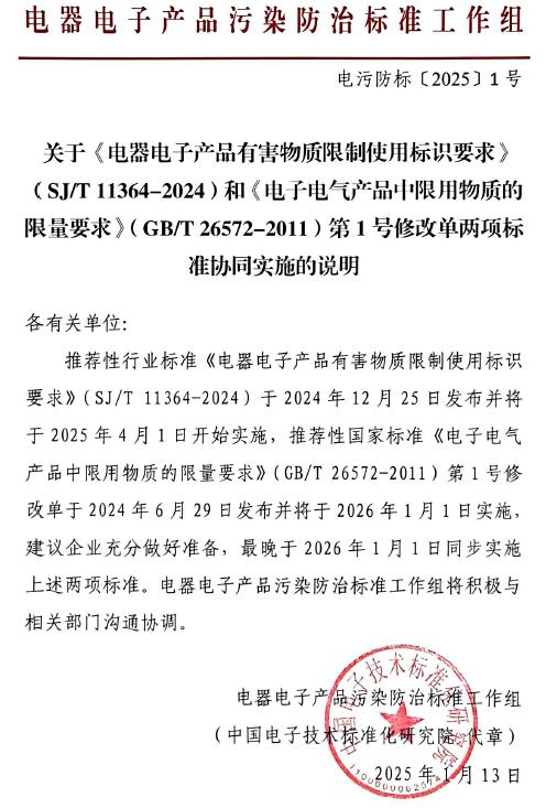 2024 年 1 月 13 日,中国电器电子产品污染防治标准工作组发布了关于《电器电子产品有害物质限制使用标识要求》(SJ/T11364-2024)和《电子电气产品中限用物质的限量要求》(GB/T26572-2011)第 1 号修改单两项标准协同实施的说明通知。