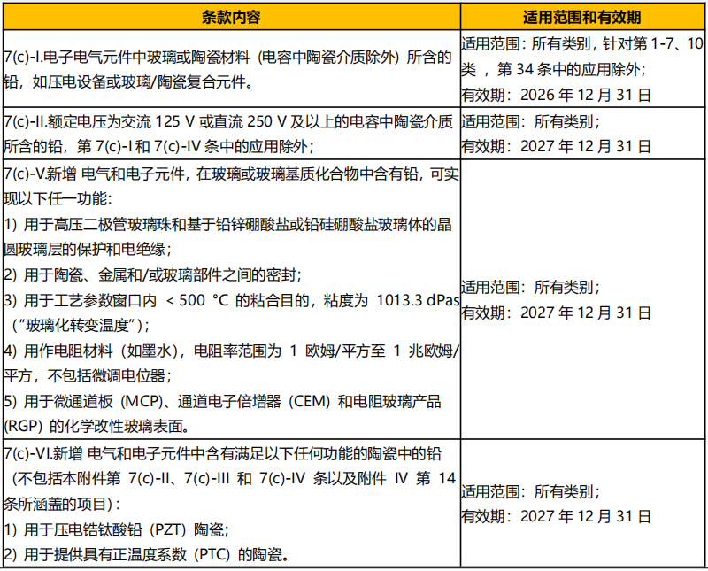 2025 年 1 月 6 日,欧盟向 WTO 提交G/TBT/N/EU/1102、G/TBT/N/EU/1103 和 G/TBT/N/EU/1104三项通知,涉及欧盟 RoHS 指令附件 III 中高频使用豁免条款的修订,包括 6(a)、6(a)-I、6(b)、6(b)-I、6(b)-II、6(c)、7(a)、7(c)-I 和 7(c)-II 关于钢合金、铝合金、铜合金、高熔化温度型焊料、电气电子元件玻璃陶瓷中的铅等条款。