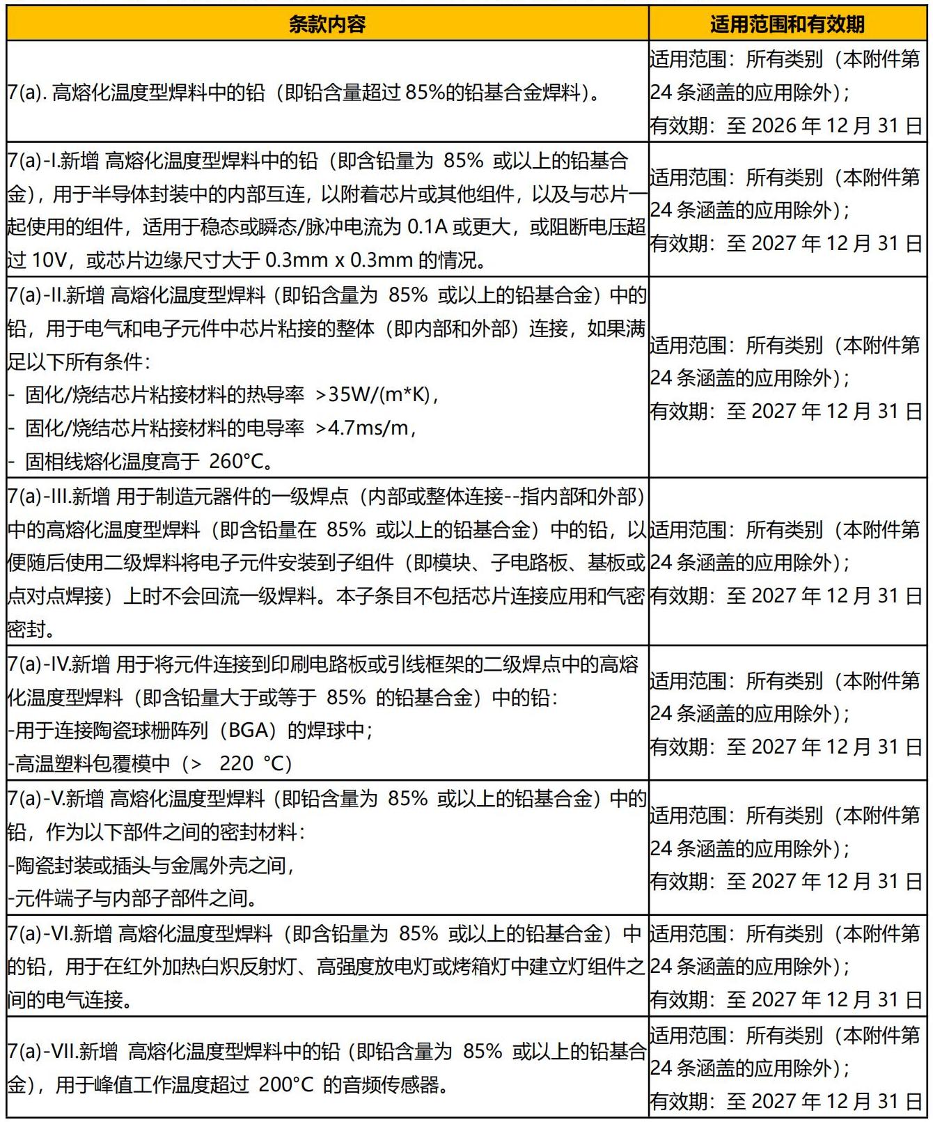 拟更新附件 III 第 7(a)项豁免条款,对高熔化温度型焊料中的铅的使用场景进行了说明。