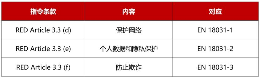 欧盟于 2024 年 11 月 30 日公告 EN 18031 标准,分别为 EN 18031-1:2024, EN 18031-2:2024 , EN 18031-3:2024 。将于 2025-02-28 正式 DOP,这意味着将有一个专用的 EN 标准来证明产品符合 RED 指令中的网络安全要求。