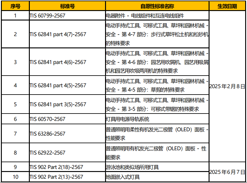 泰国工业标准协会(TISI)于 2025 年2 月 7 日更新TIS 标准清单,新增多项自愿性标准,见表 3。